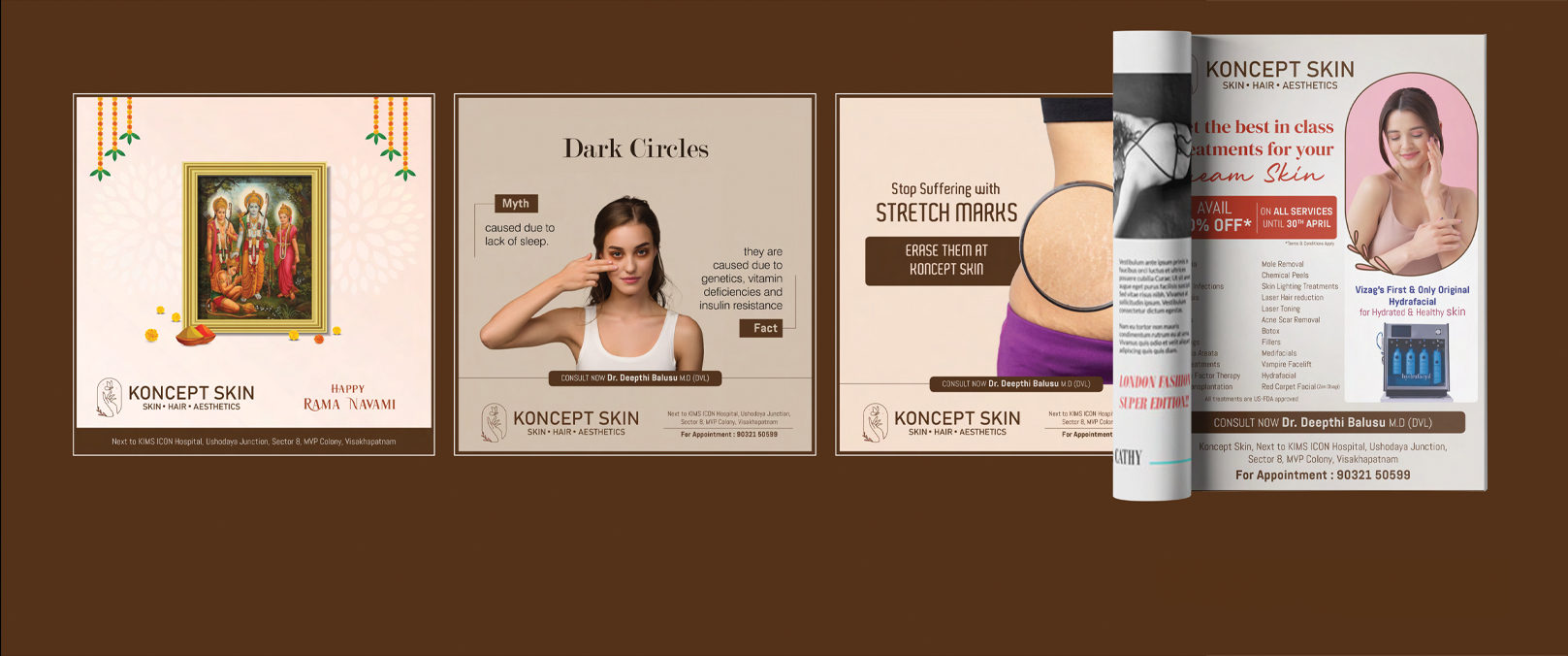 We collaborated with Koncept Skin Clinic to build a complete brand presence—from crafting a unique logo to designing a clean, modern website that reflects the clinic’s professionalism and trust. Our goal was to create a consistent visual language that enhances the clinic’s credibility and connects with its audience across every touchpoint.